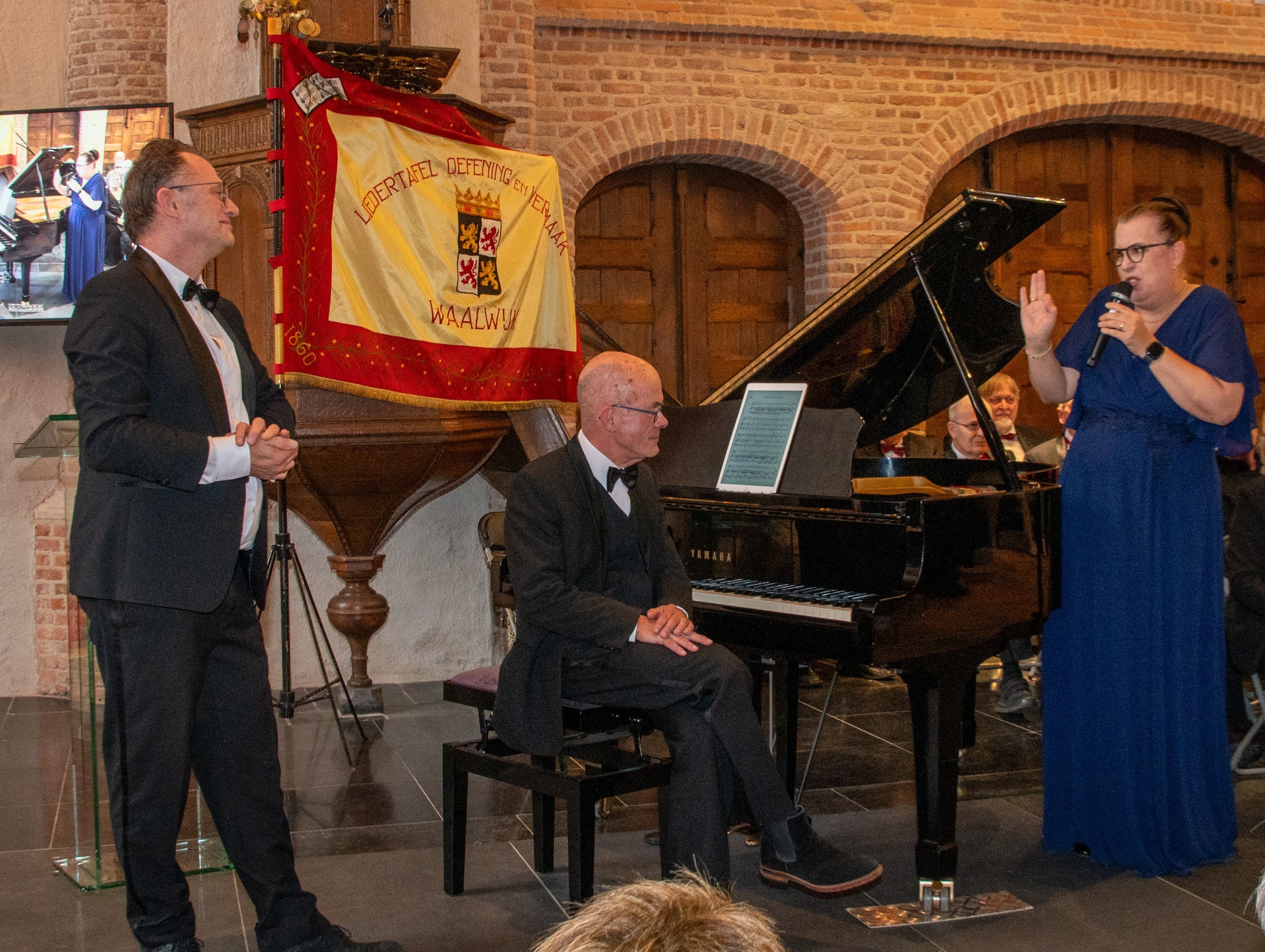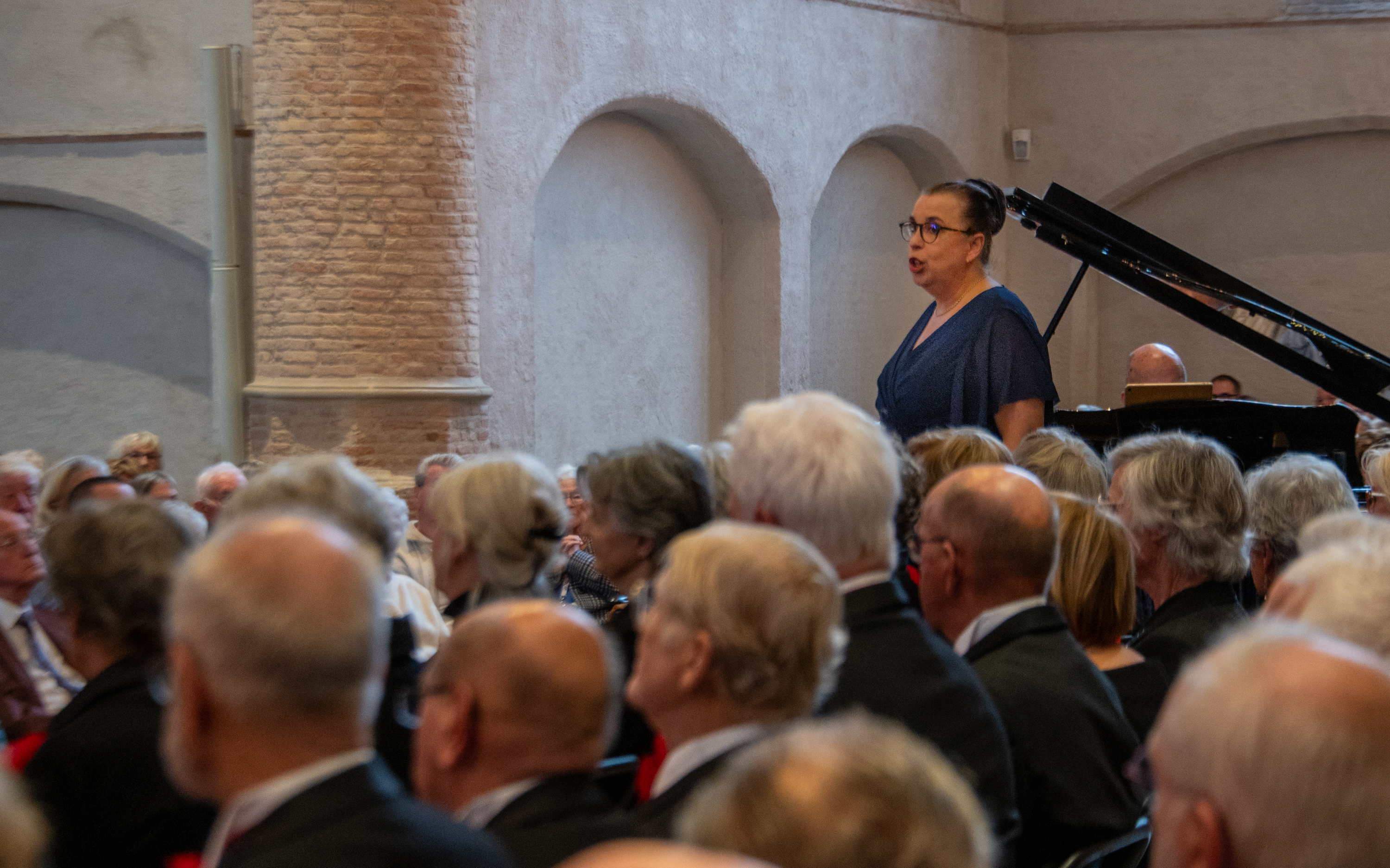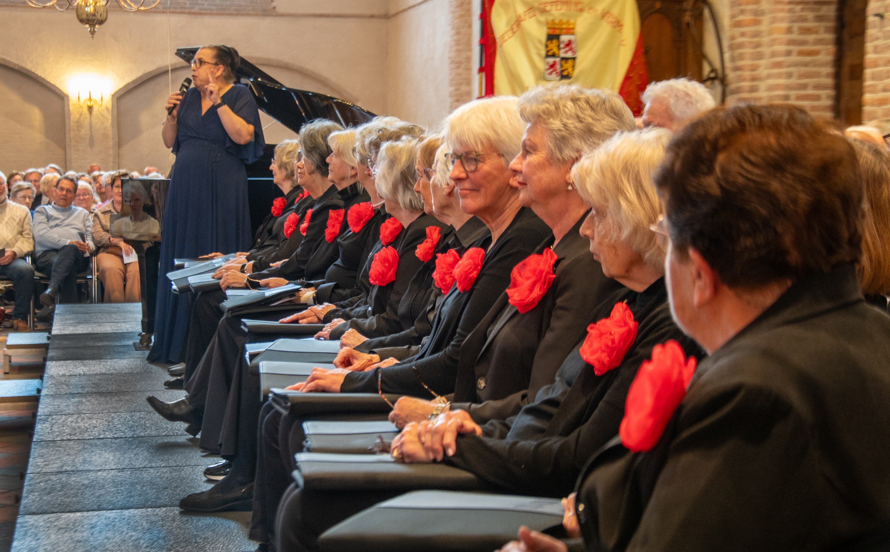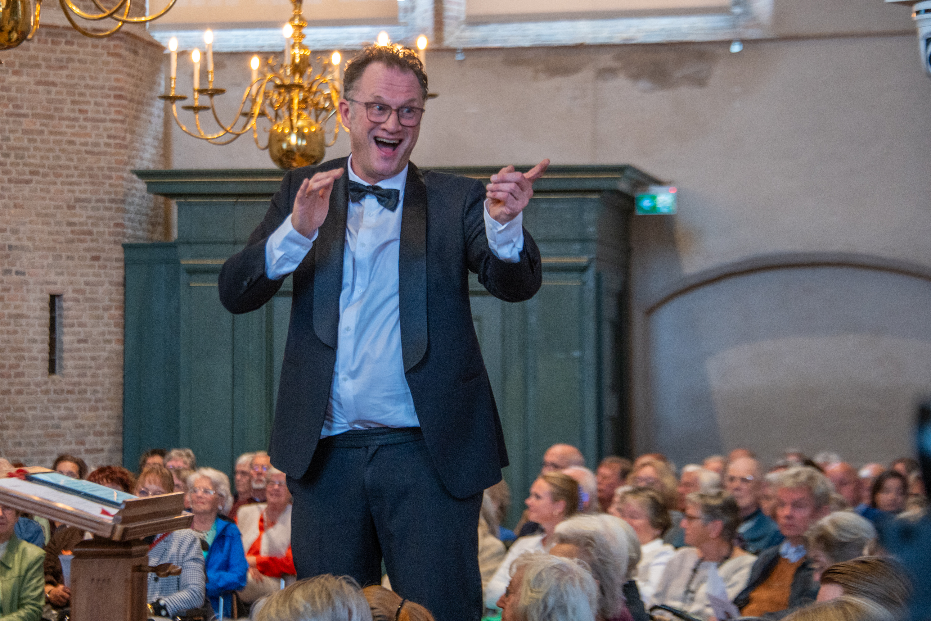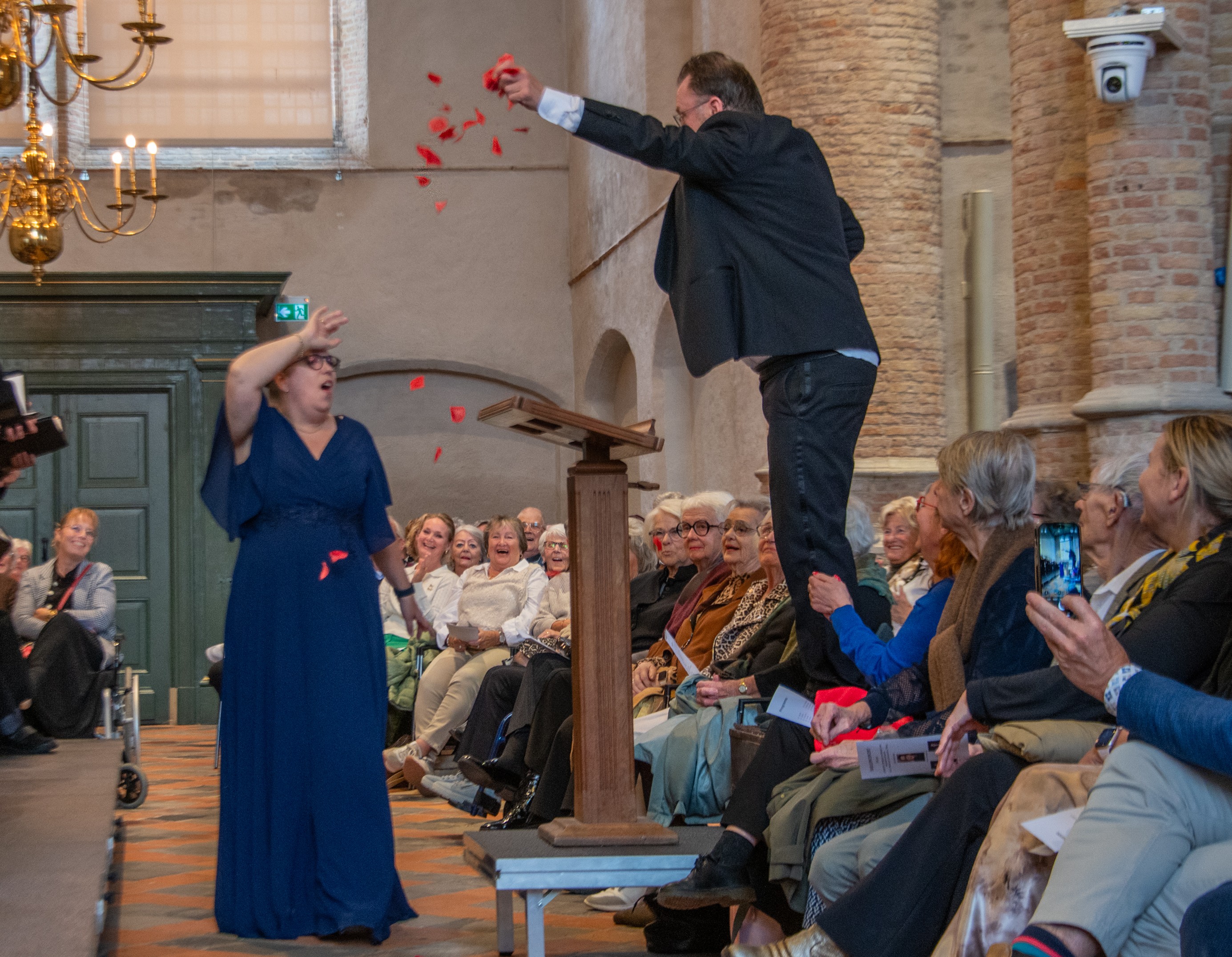 Als soliste trad Francis van Broekhuizen op en tja, dan zit de stemming er al snel in. Als veelzijdig sopraan wist zij door haar ontwapenende optreden regelmatig het publiek een schaterlach te ontlokken. Daarnaast ontbrak het emotionele element niet: het ontroerde velen toen het bekende O mio babbino caro van G. Puccini door de ruim 500 jaar oude kerk klonk.